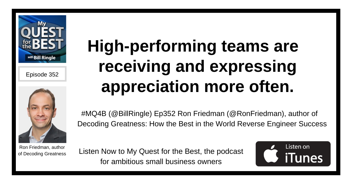 High-performing teams are receiving and expressing appreciation more often. Ron Friedman (@ RonFriedman) shares on My Quest for the Best, the podcast for ambitious small business leaders.#MQ4B https://myquestforthebest.com/