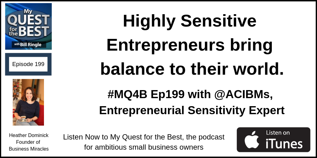 Highly Sensitive Entrepreneurs bring balance to their world.[pullquote align=”normal” cite=”Heather Dominick, on My Quest for the Best”]“Highly Sensitive Entrepreneurs bring balance to their world.”[/pullquote]Listen on iTunes