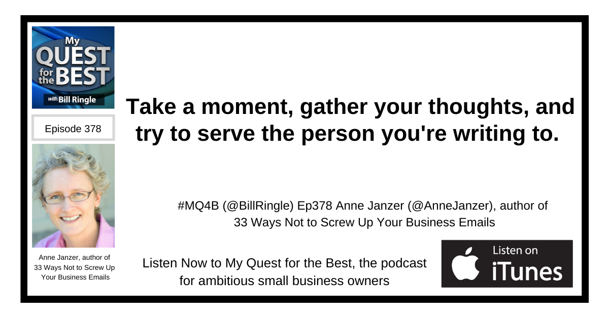 Take a moment, gather your thoughts, and try to serve the person you’re writing to. Anne Janzer (@AnneJanzer) shares on My Quest for the Best, the podcast for ambitious small business leaders.#MQ4B https://myquestforthebest.com/
