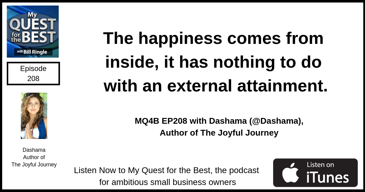 The happiness comes from inside, it has nothing to do with external attainment.[pullquote align=”normal” cite=”Dashama, on My Quest for the Best”]The happiness comes from inside, it has nothing to do with external attainment.[/pullquote]Listen on iTunes