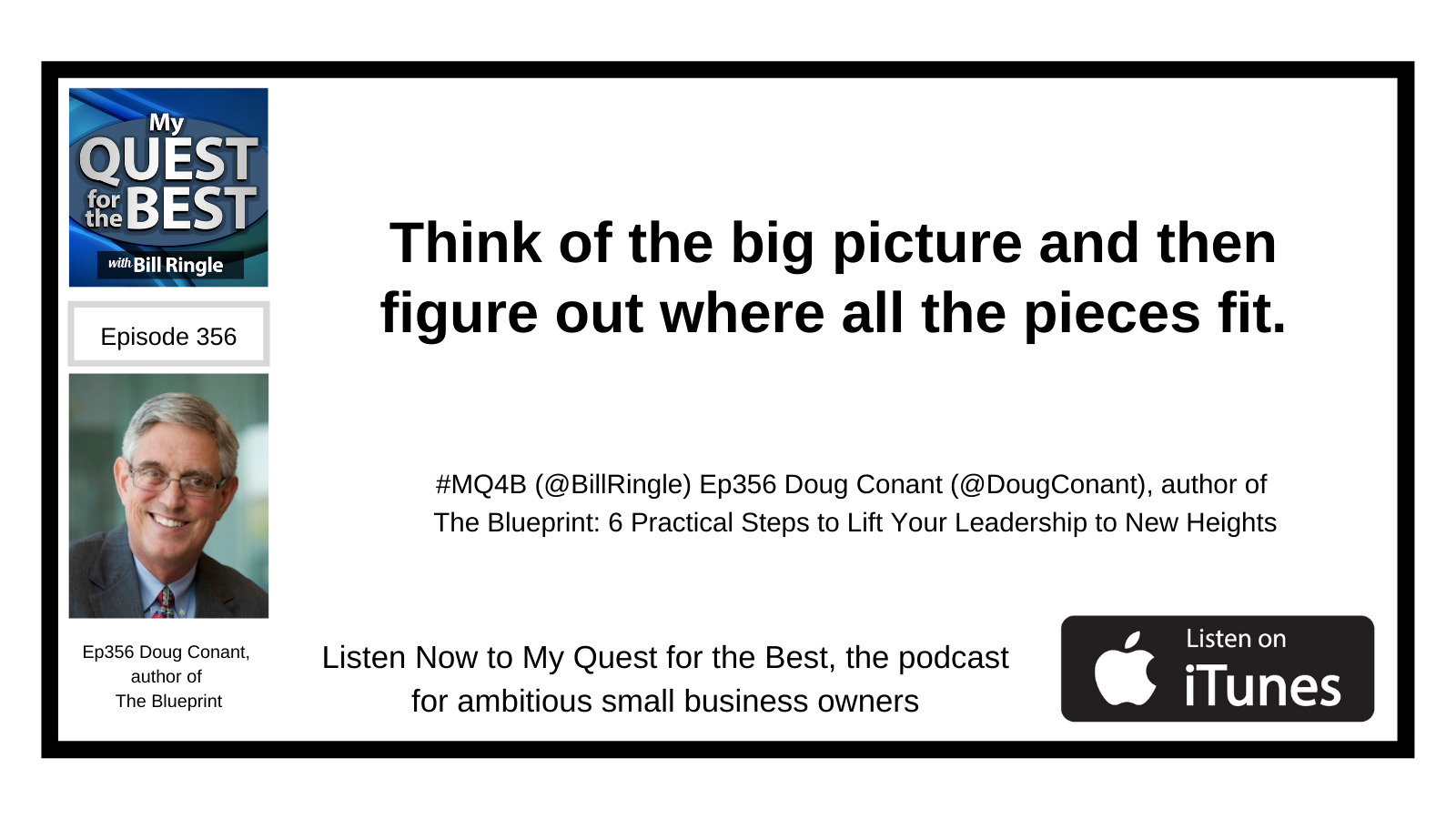 Think of the big picture and then figure out where all the pieces fit. Doug Conant (@DougConant) shares on My Quest for the Best, the podcast for ambitious small business leaders.#MQ4B https://myquestforthebest.com/
