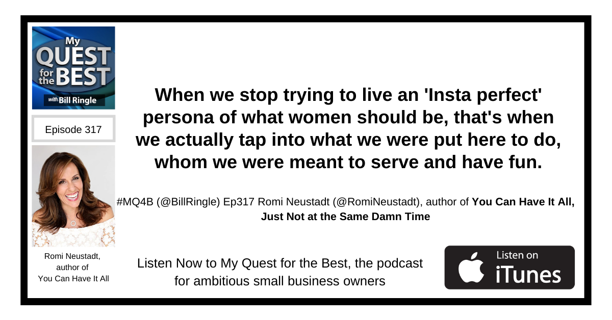 When we stop trying to live an ‘Insta perfect’ persona of what women should be, that’s when we actually tap into what we were put here to do, whom we were meant to serve and have fun. Romi Neustadt @RomiNeustadtr shares on My Quest for the Best, the podcast for ambitious small business leaders. #MQ4B https://myquestforthebest.com/